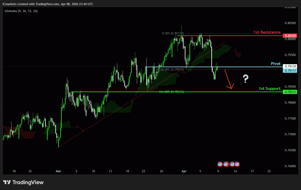 The price could see a short-term pullback toward the pivot before continuing its bearish move down toward the 1st support.