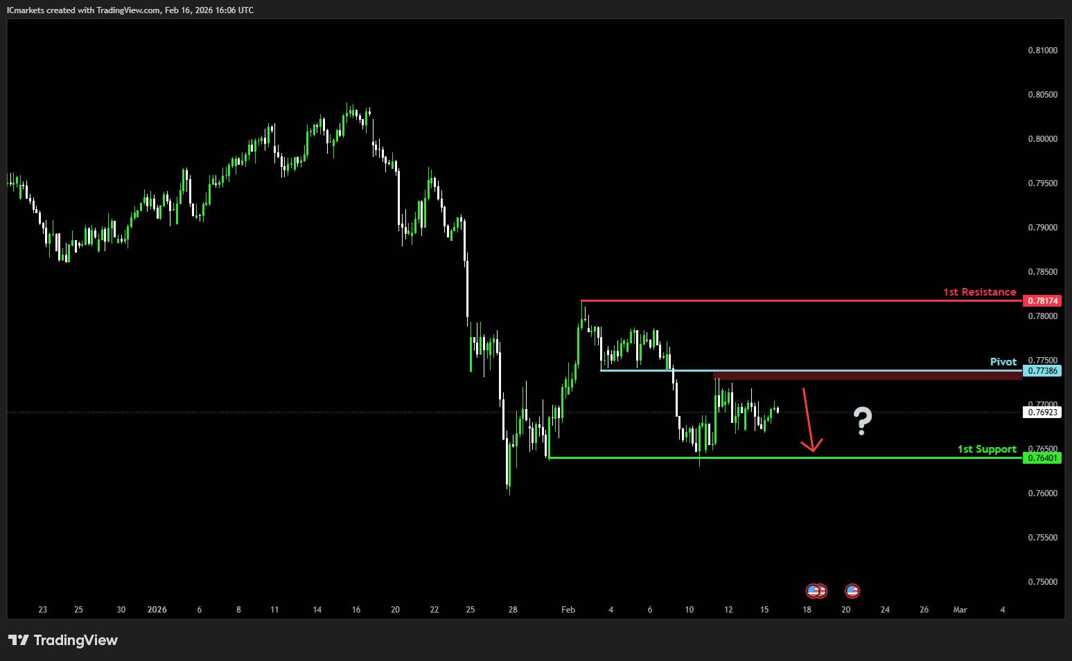 The price is reacting off the pivot and may fall toward the 1st support.