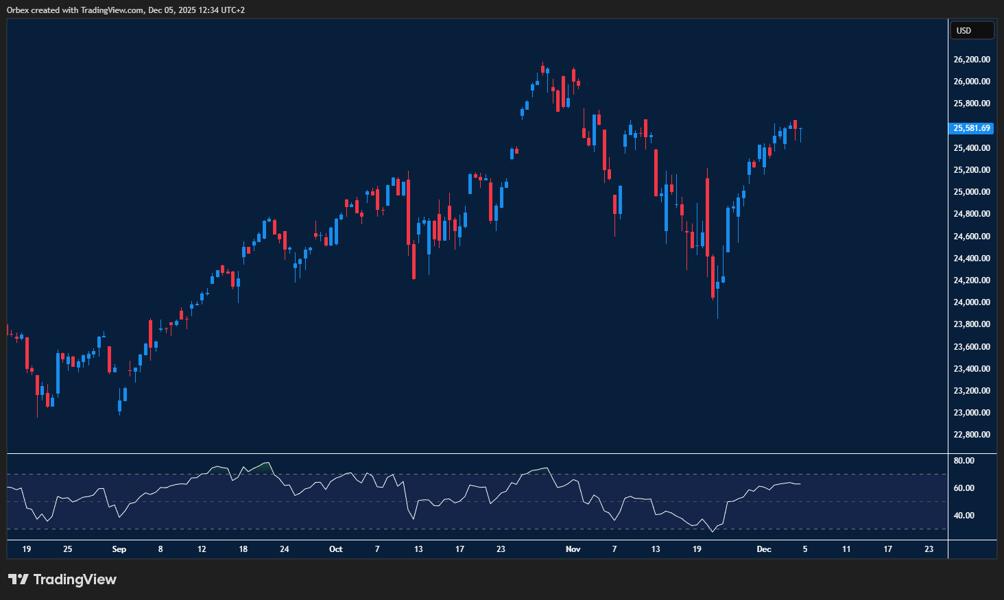 The Nasdaq 100 index has recouped most of its losses from the November sell-off as sentiment remains cautious. The spike at 25600 is a key obstacle where a breakout could ease any signs of selling pressure and pave the way for another record high. However, sellers could be looking to sell into strength as the RSI moves towards the overbought region. 25000 at the base of the latest bullish thrust is the closest support in case of a retracement.