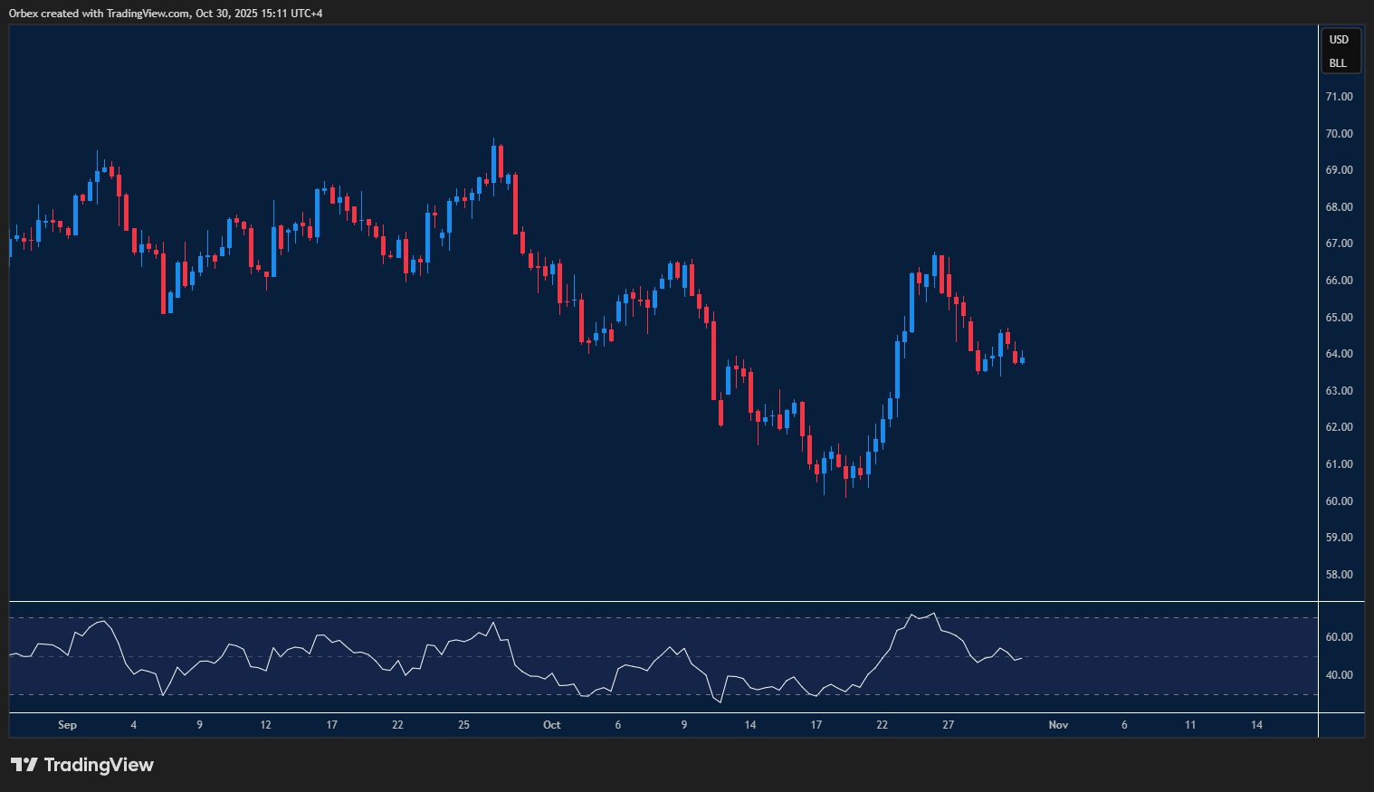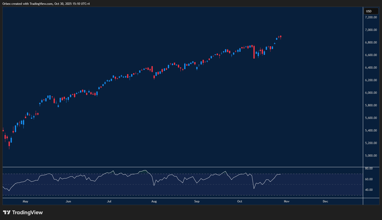 The S&P500 reached another record high amid optimism over a strong earnings season report and another rally in tech and AI stocks. With the Fed expected to maintain its dovish stance on rate cuts, stocks in general seem unfazed. As the index powers towards 7000 for the first time, any chance of a pullback would see 6600 as the first support. Corporate earnings will be a significant guide to how far the S&P can go over the next month.